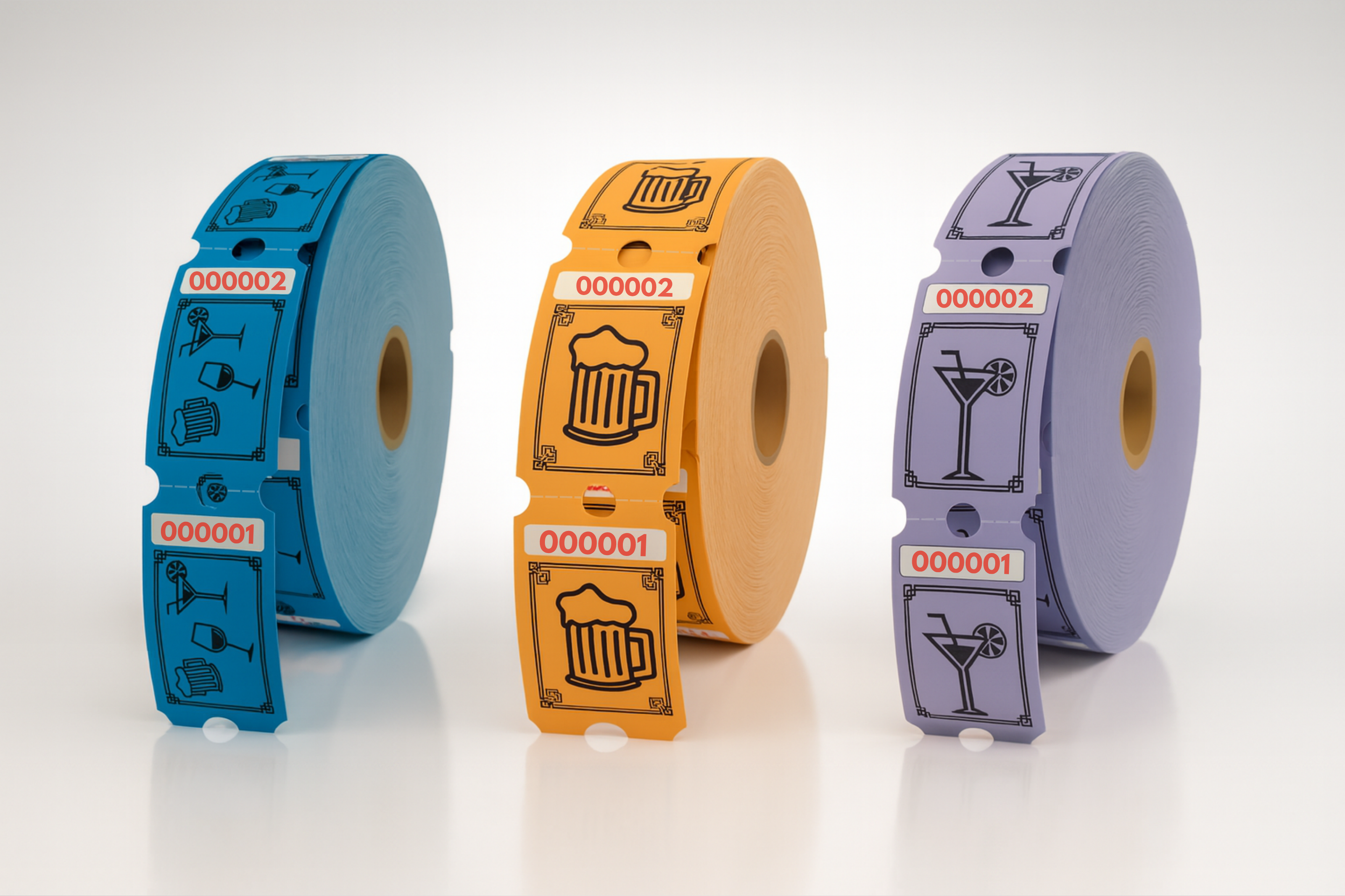 We also provide entrance tickets in rolls, as well as drink tickets, both of which are delivered in high-quality 'wood-free' 120 gsm paper. Drink and entrance tickets can also be customized to your liking with text and logos.